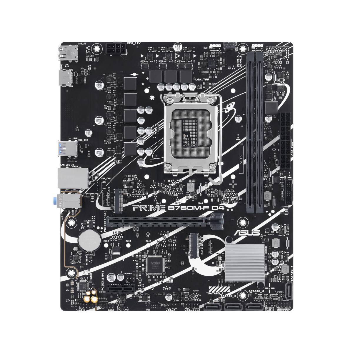 ASUS PRIME B760M-F DDR4 được trang bị PCIe 4.0 x16 cho card đồ họa, cùng 2 khe M.2 PCIe 4.0 hỗ trợ SSD tốc độ cao (loại 2242/2260/2280) và 4 cổng SATA 6Gb/s cho ổ cứng hoặc SSD truyền thống. Các cổng kết nối bao gồm HDMI (hỗ trợ 4K@60Hz), cùng mạng LAN Realtek 1Gb Ethernet, đáp ứng nhu cầu kết nối cơ bản nhưng hiệu quả. Mainboard cũng hỗ trợ USB 5Gbps phía trước (tổng cộng 6 cổng USB phía trước và 8 cổng phía sau), đảm bảo khả năng kết nối linh hoạt với các thiết bị ngoại vi.