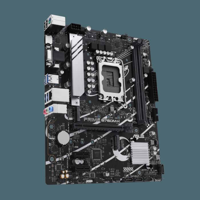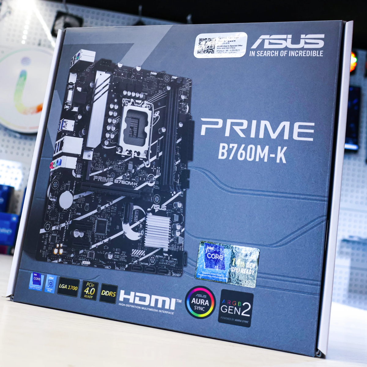 Mainboard Asus Prime B760M-K DDR5 sử dụng socket Intel LGA 1700, hỗ trợ các dòng vi xử lý Intel thế hệ 12, 13 và 14, đem lại hiệu năng cao và khả năng nâng cấp dài hạn. Bo mạch chủ trang bị 2 khe RAM DDR5, hỗ trợ dung lượng tối đa 96GB với các mức xung nhịp ấn tượng từ DDR5 4800MHz đến DDR5 8000MHz (OC). Cấu trúc bộ nhớ kênh đôi (Dual Channel) giúp tối ưu băng thông và cải thiện hiệu suất xử lý vượt bậc cho các tác vụ đa nhiệm, thiết kế đồ họa hoặc chơi game ở cấu hình cao.