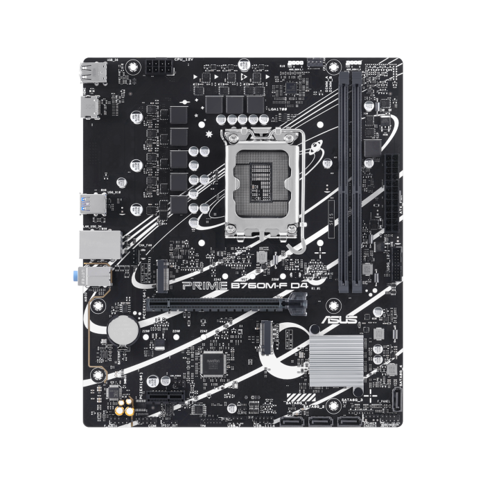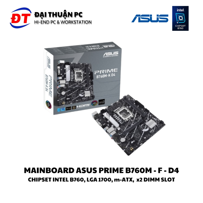 ASUS PRIME B760M-F DDR4 được trang bị PCIe 4.0 x16 cho card đồ họa, cùng 2 khe M.2 PCIe 4.0 hỗ trợ SSD tốc độ cao (loại 2242/2260/2280) và 4 cổng SATA 6Gb/s cho ổ cứng hoặc SSD truyền thống. Các cổng kết nối bao gồm HDMI (hỗ trợ 4K@60Hz), cùng mạng LAN Realtek 1Gb Ethernet, đáp ứng nhu cầu kết nối cơ bản nhưng hiệu quả. Mainboard cũng hỗ trợ USB 5Gbps phía trước (tổng cộng 6 cổng USB phía trước và 8 cổng phía sau), đảm bảo khả năng kết nối linh hoạt với các thiết bị ngoại vi.