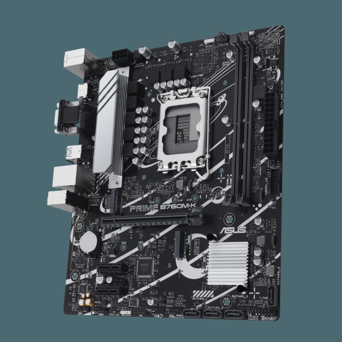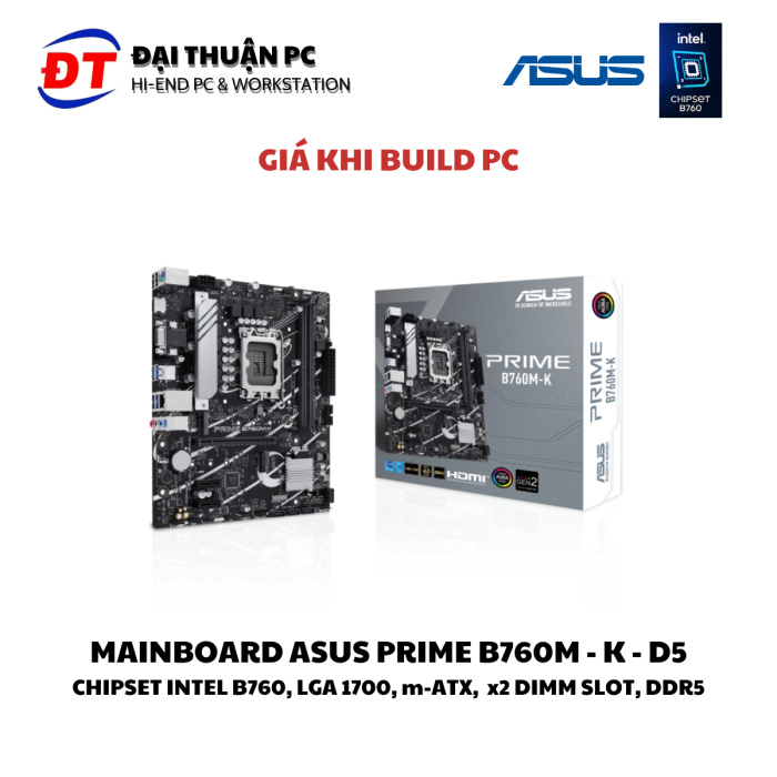 Mainboard Asus Prime B760M-K DDR5 sử dụng socket Intel LGA 1700, hỗ trợ các dòng vi xử lý Intel thế hệ 12, 13 và 14, đem lại hiệu năng cao và khả năng nâng cấp dài hạn. Bo mạch chủ trang bị 2 khe RAM DDR5, hỗ trợ dung lượng tối đa 96GB với các mức xung nhịp ấn tượng từ DDR5 4800MHz đến DDR5 8000MHz (OC). Cấu trúc bộ nhớ kênh đôi (Dual Channel) giúp tối ưu băng thông và cải thiện hiệu suất xử lý vượt bậc cho các tác vụ đa nhiệm, thiết kế đồ họa hoặc chơi game ở cấu hình cao.